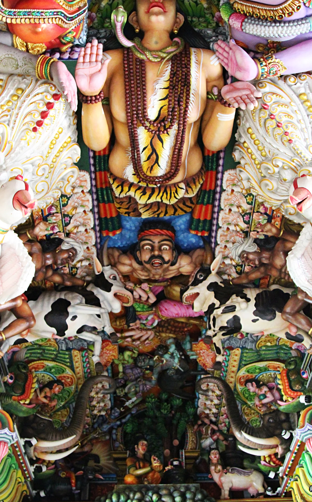 The outside of the Pathirakali Amman temple is insane. A Hindu temple in the Dravidian style of architecture, it resembles a grand rainbow-hued birthday cake, with added gods and creatures busily battling, climbing and grinning down at us. The further we walked around the building, the more elaborate it got. But we couldn’t have predicted what was inside.
