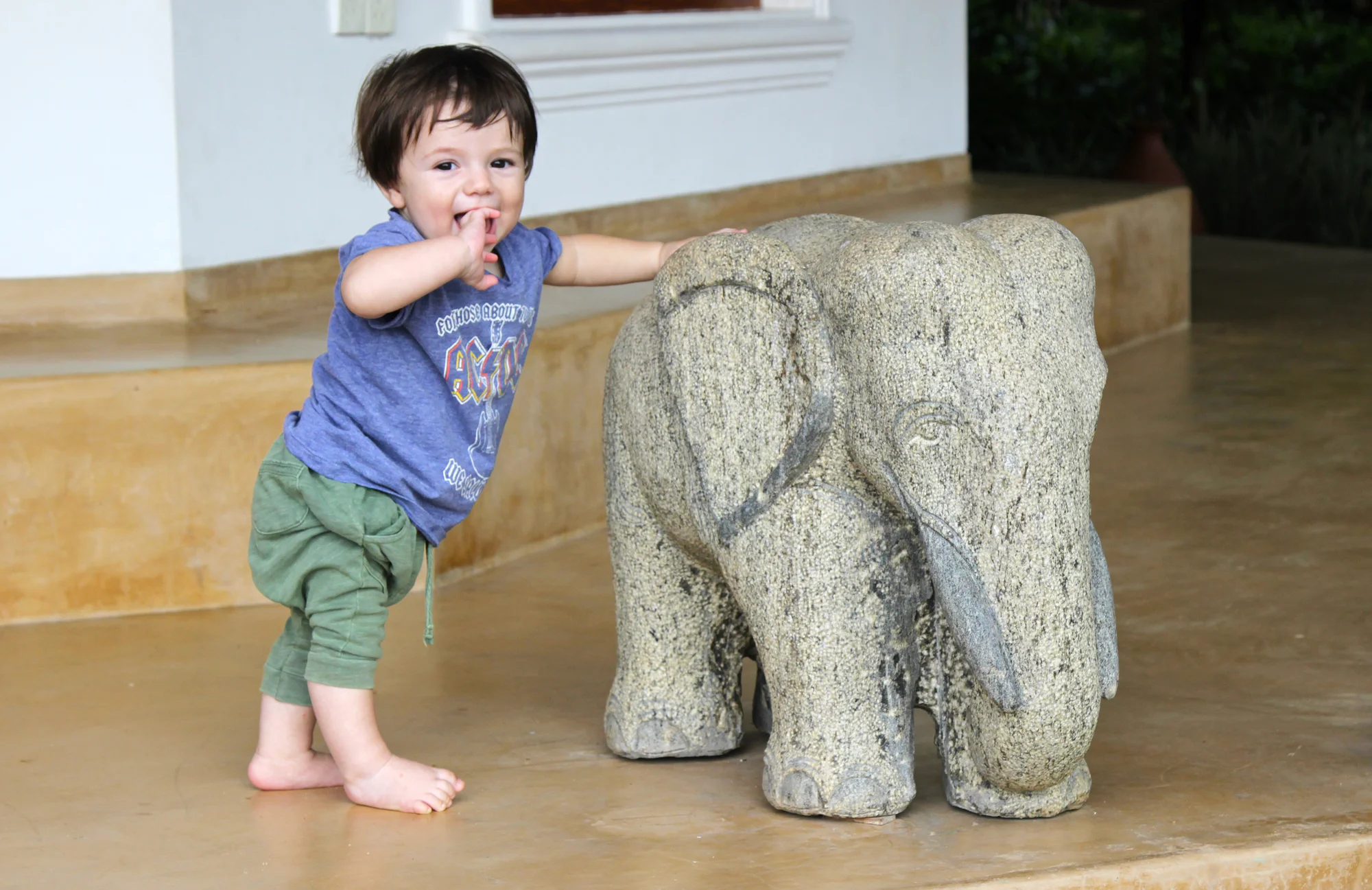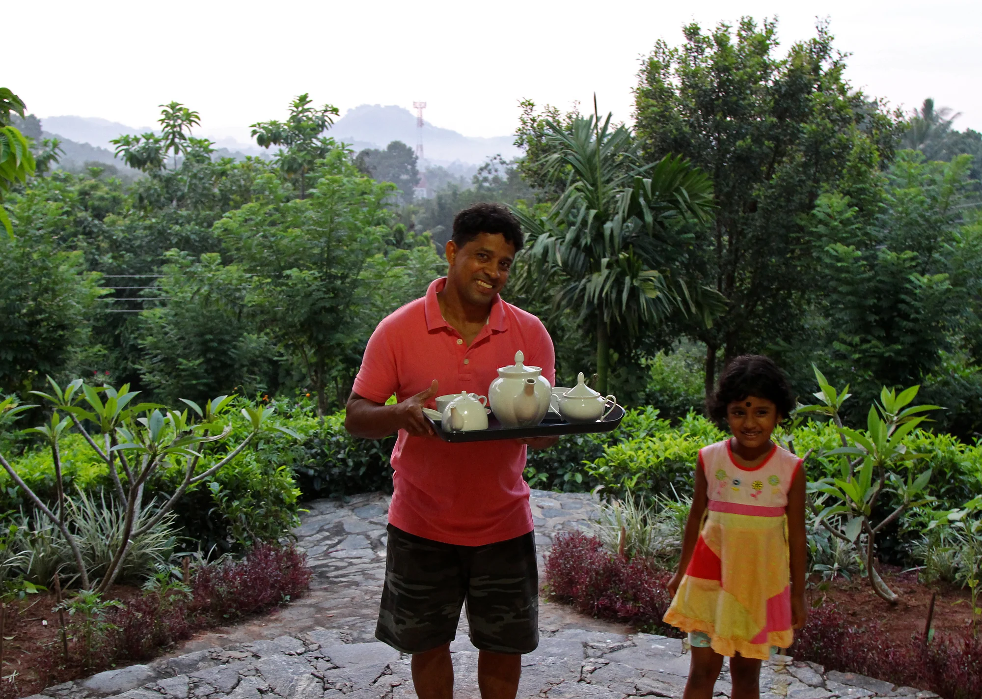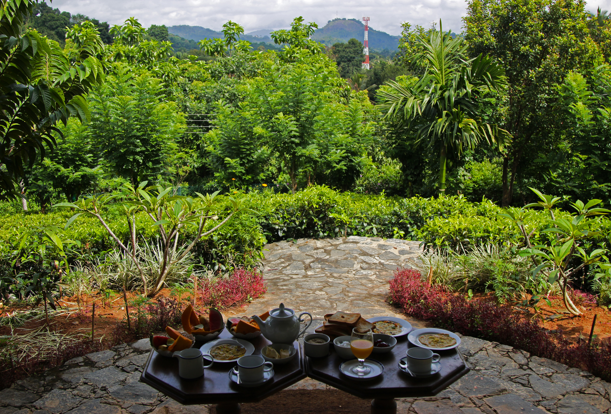 An average day in the Octagon is peaceful in the extreme. The building itself is minimal but luxurious in its own distinctive way. This isn't about the thread count on the sheets or fancy mini toiletries in the bathroom. For a start, the place is ours. No neighbours, bar the tea pickers and the odd gecko. No noise, though a drum is provided should you want some. Just one huge room with a four poster bed complete with the necessary mosquito nets, a large writing desk, an armchair, the world's most comfortable beanbag and a smattering of books. The floor space is vast and blissfully clean, which is especially good news when you have a crawling, shuffling eight month old baby who occasionally licks the nearest surface. Outside, a veranda wraps its way around the entire place, complete with hammock, breakfast table and two friendly stone elephants keeping guard. And in front of it all is our own personal tea plantation, the bed of electric green leaves setting the stage for sunsets, rainbows and whatever other spectaculars nature has up its sleeve.