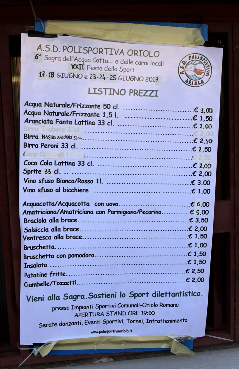 So back to Oriolo. The sagra is no fine dining establishment. There are no frills or ceremony. Sometimes, you’ll choose from a paper menu that doubles as a placemat, bellowing your order over the crowds to an awkward teenager from the village who’s playing waiter for the night. In this case, you choose from a roughly-printed list taped to the outside of a hut, then hover outside until a man pokes his megaphone out of his window and half deafens you with your order number. Off we go, juggling our exploding baby, sceptical four-year-old and plastic trays loaded with chips, wine and the all-important acquacotta.