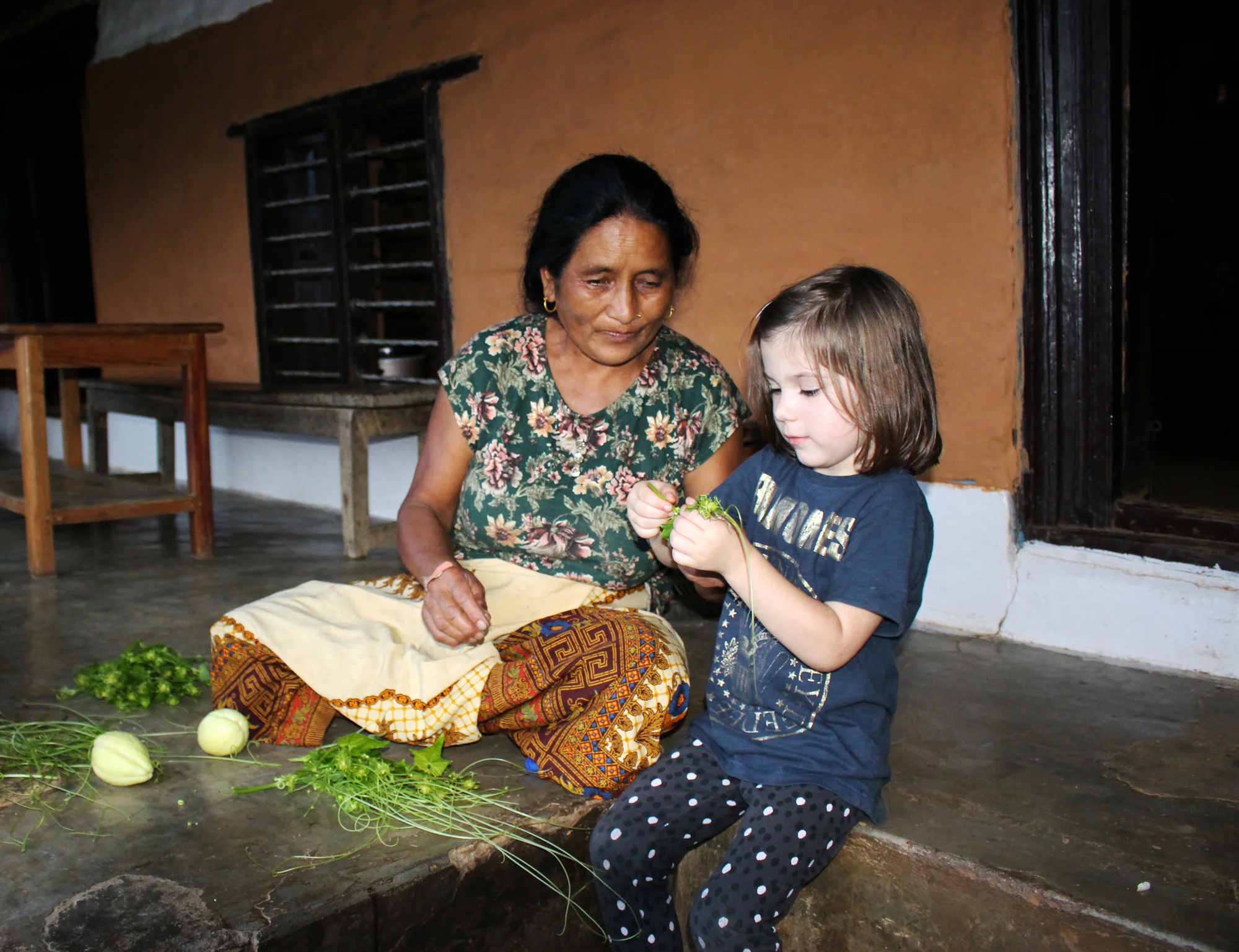 During the day, it’s up to you. If you just want to sit on your porch and play Snakes and Ladders with a local child, that’s fine. But if you wander a little further afield, there are endless activities for kids to take part in. Some take half an hour, some a little more. But they’re all within walking distance and they’re all actually educational without seeming it. Olivia and Lori counted the things she’d learned in one day, and from making butter and yogurt from buffalo milk to seeing a rice mill in action and eating jungle berries in front of the world’s highest mountains range, there were sixteen of them. Sixteen.