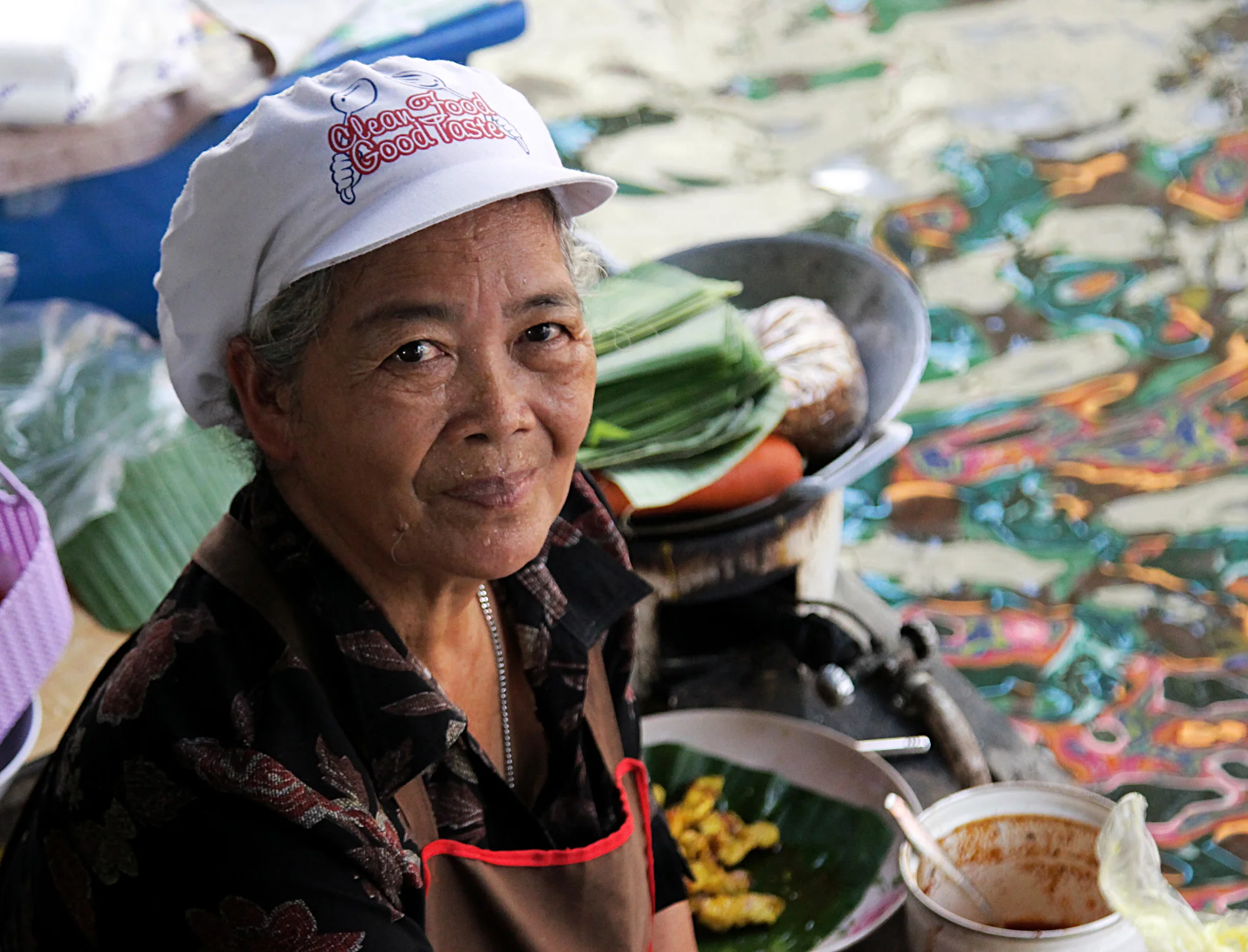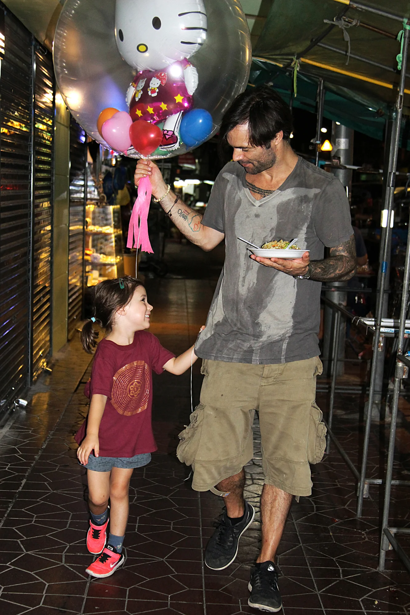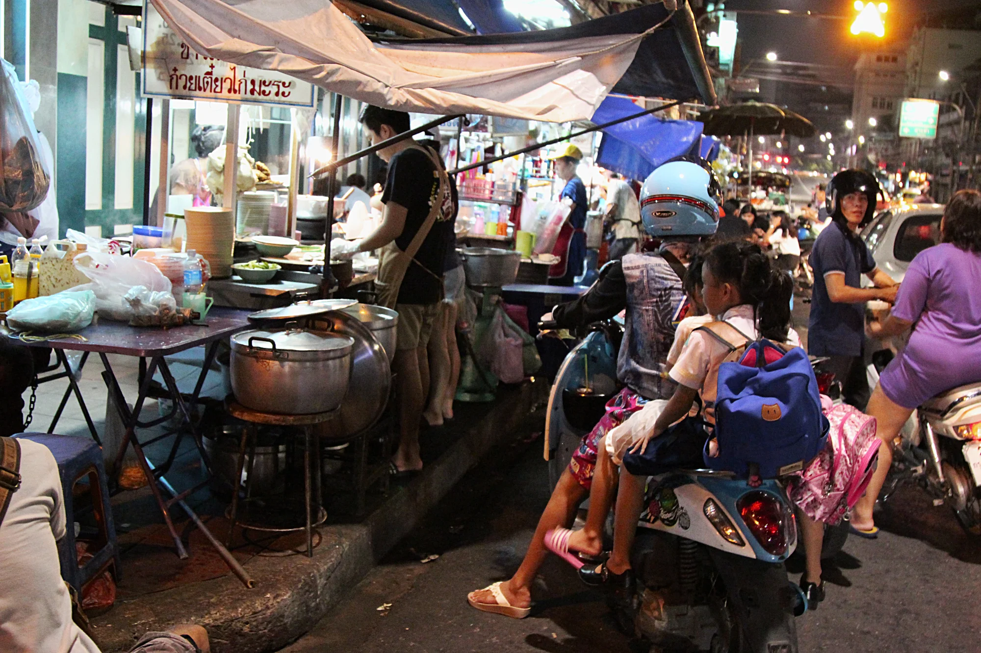 She starts with a bang, or a bug to be precise. Showing off her impressive lack of squeamishness, she inspects the cricket, giggles, and eats the lot, much to the amusement of the more reluctant passersby. She gobbles marinated pork on wooden sticks as she wanders down Khao San, and destroys prawns in tempura batter with sweet chili sauce as we navigate the chaos of Chinatown. She tries mango and sticky rice from a banana leaf and devours a 30 baht pad thai back in our hotel room.
