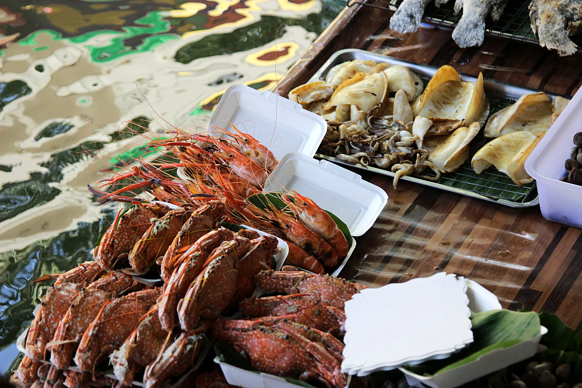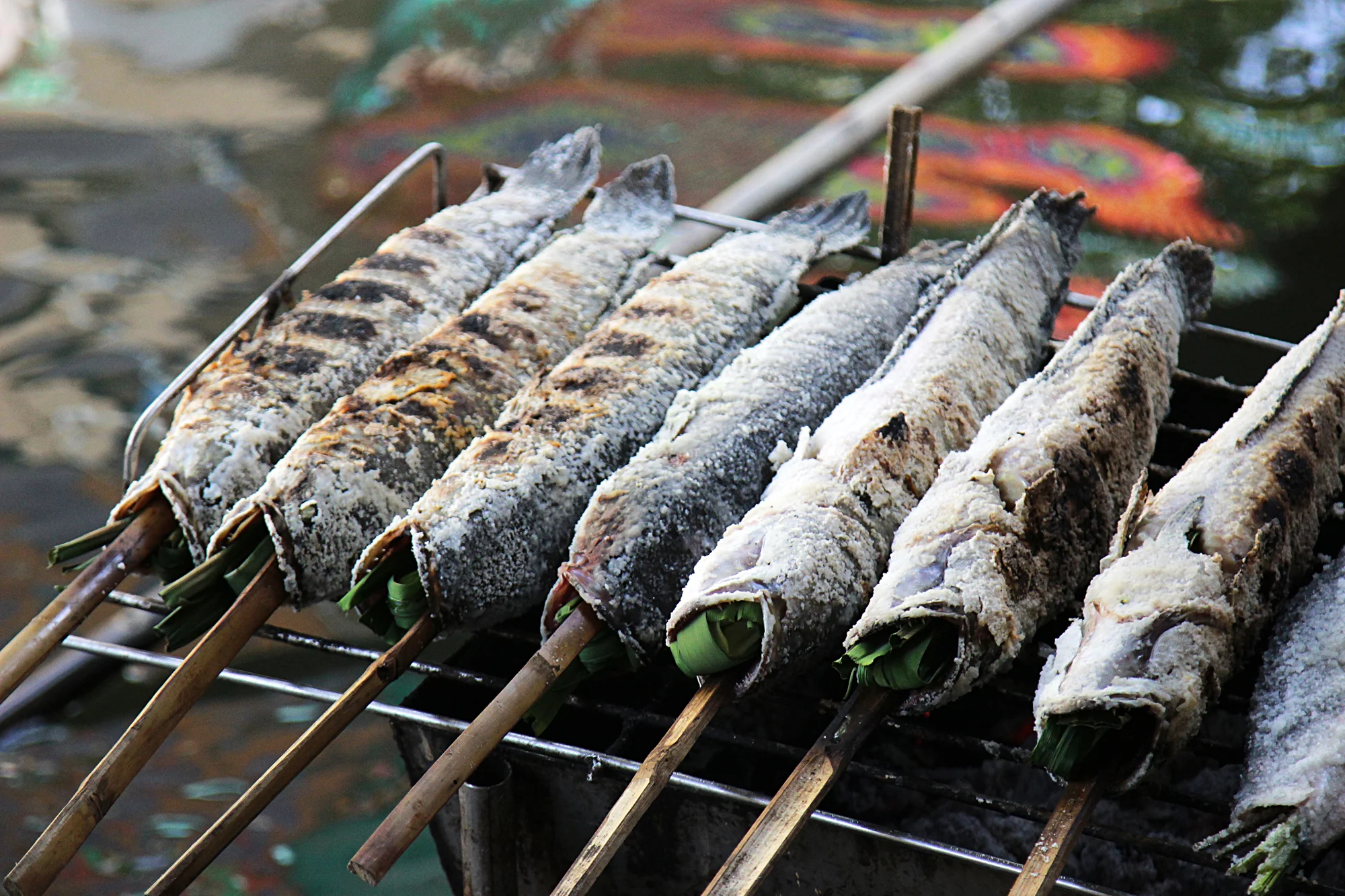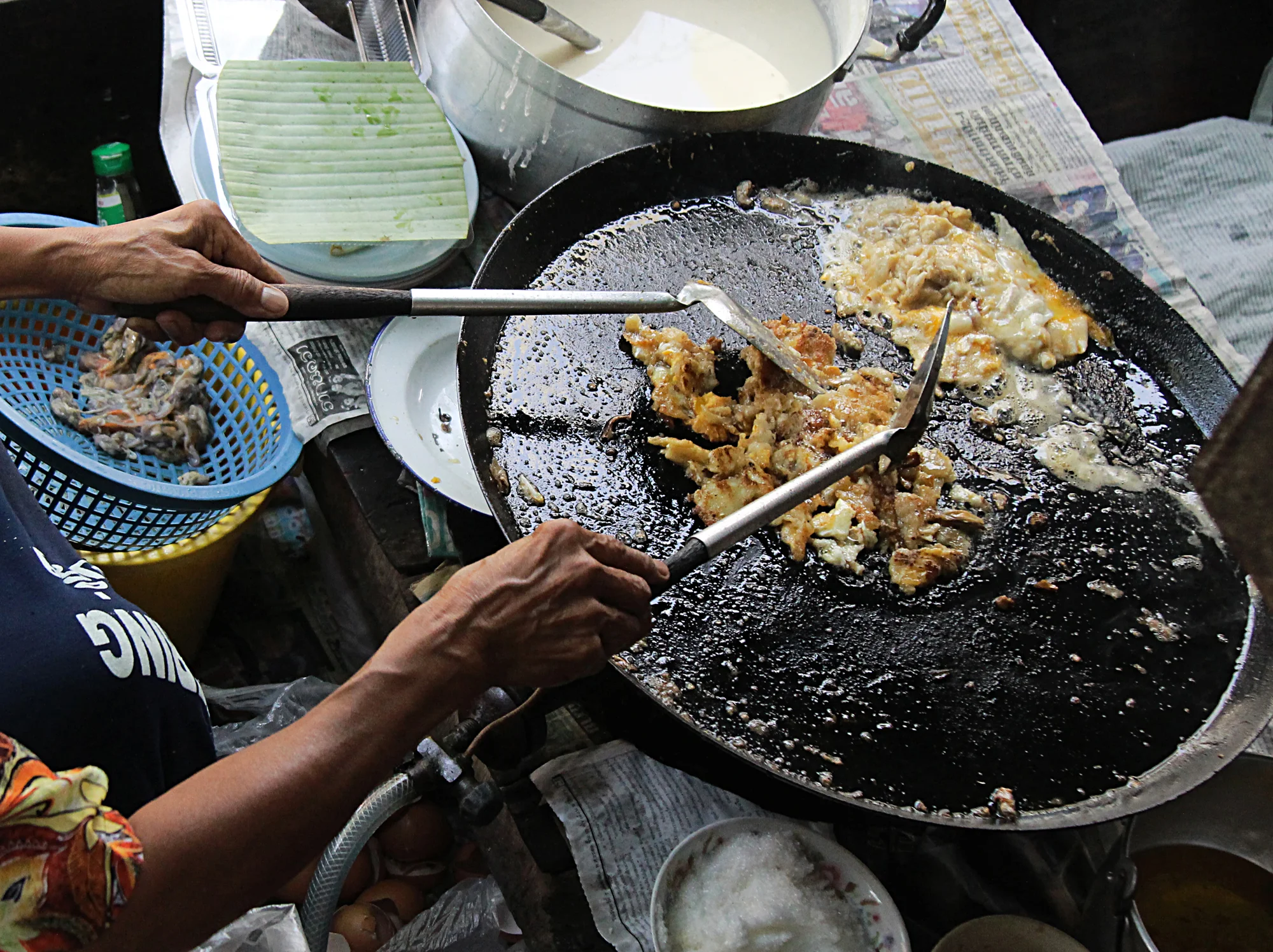 We take the gastronomic game out onto the water later that week, as we work our way through the Taling Chan floating market. Smaller than the commercial spectacle of Damnoen Saduak, Taling Chan consists of a larger 'normal' market and a few boats on which some formidable Thai ladies stoke their charcoal fires and grill all sorts of happiness. The surrealism of the setup works again, and before long Olivia is jumping from stall to stall and rickety platform to bridge. Between all that jumping, she tries jet-black jelly, violet butterfly pea juice, grilled squid and scallops with slivers of crisped-up bacon. Somewhere in the middle, she orders pudding from a Thai cowboy, a hepcat in a brim hat who makes a killer chocolate roti. It's an entertaining, memorable patchwork of a meal.