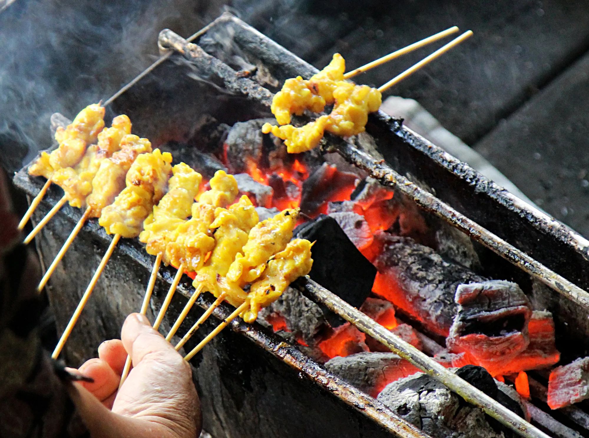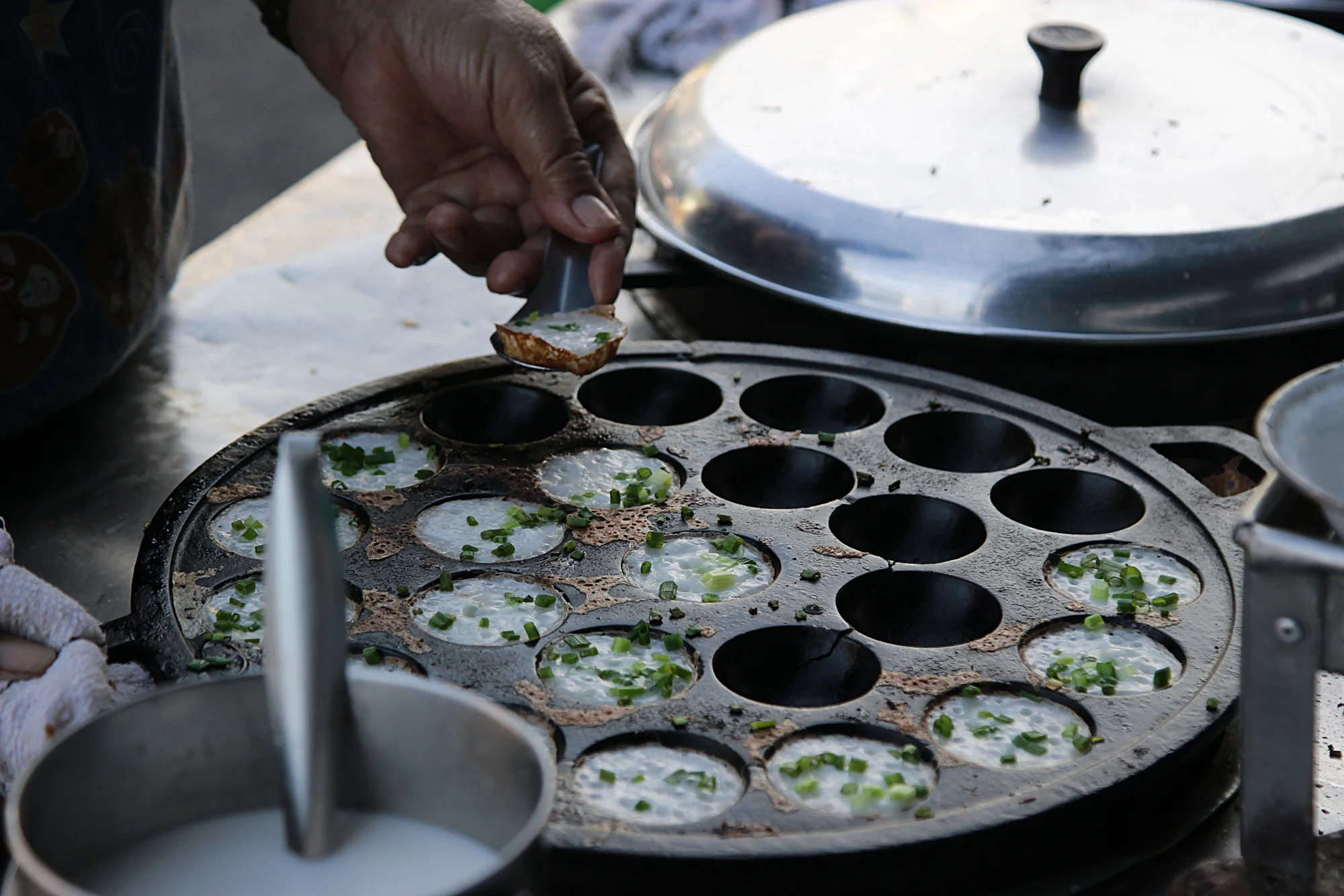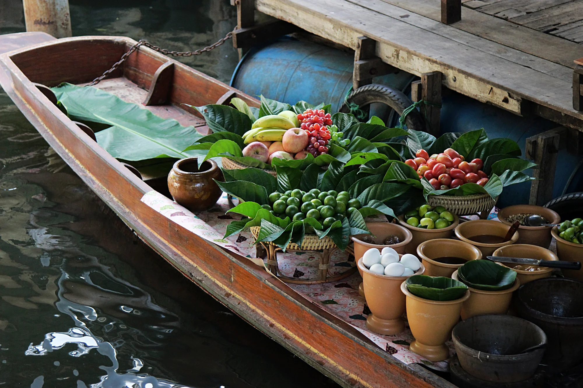 We take the gastronomic game out onto the water later that week, as we work our way through the Taling Chan floating market. Smaller than the commercial spectacle of Damnoen Saduak, Taling Chan consists of a larger 'normal' market and a few boats on which some formidable Thai ladies stoke their charcoal fires and grill all sorts of happiness. The surrealism of the setup works again, and before long Olivia is jumping from stall to stall and rickety platform to bridge. Between all that jumping, she tries jet-black jelly, violet butterfly pea juice, grilled squid and scallops with slivers of crisped-up bacon. Somewhere in the middle, she orders pudding from a Thai cowboy, a hepcat in a brim hat who makes a killer chocolate roti. It's an entertaining, memorable patchwork of a meal.
