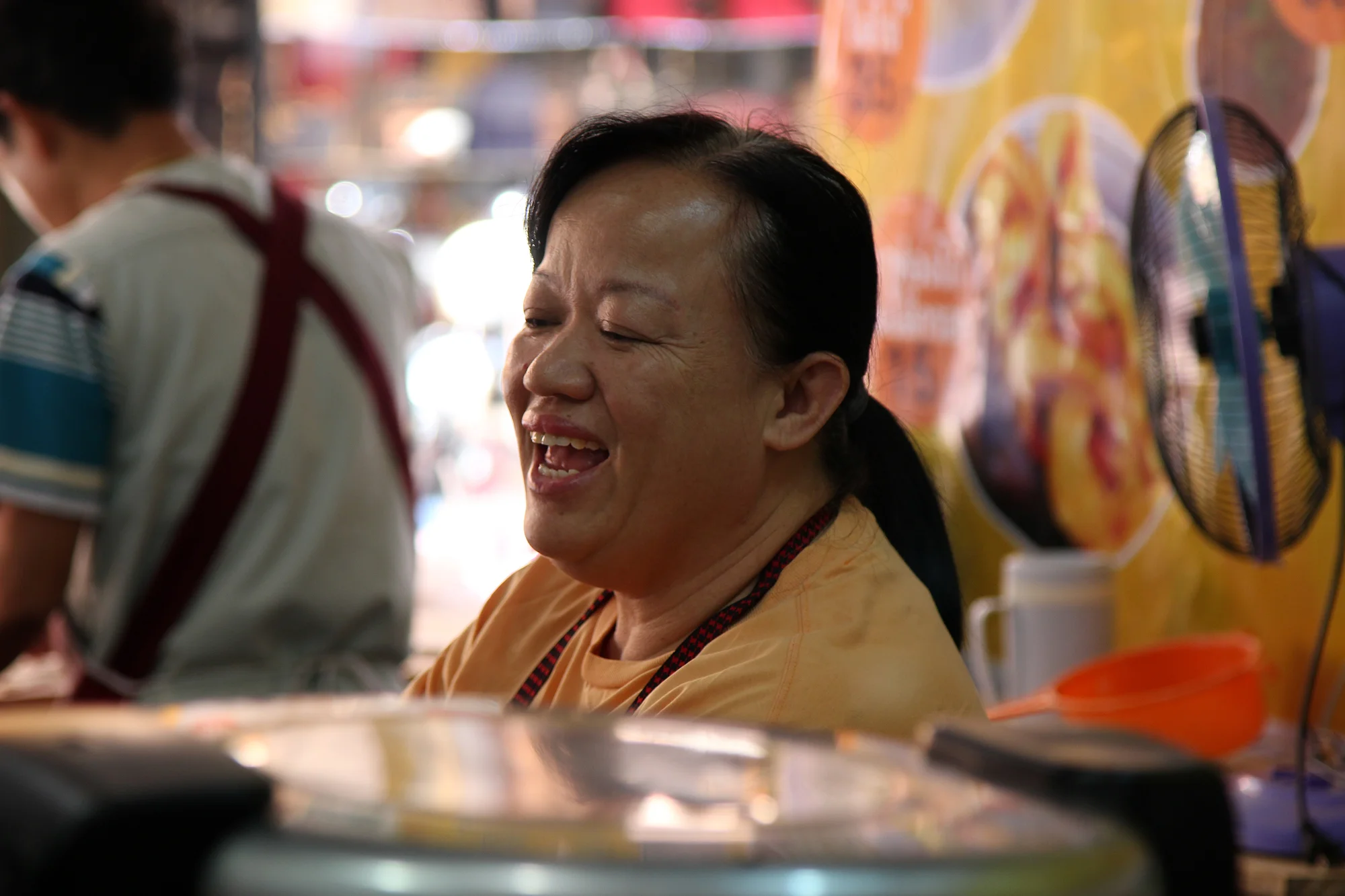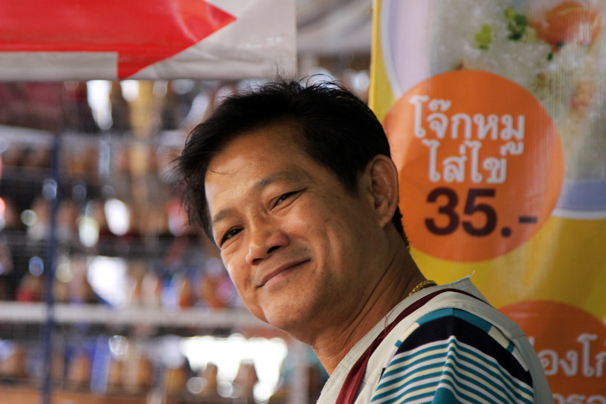 The place itself may be popular, a dream for animal lovers, pa thong ko obsessives and devotees of the cult of instagram. But in reality, it's nothing fancy. Just a white room, with a few tables covered in plastic gingham. There is news footage of Neng and his fritters on the tv high up on the wall. The napkins are a roll of toilet paper next to the finger-smudged bottles of soy sauce. Here it is, quite literally, the people who make the place. They may not all be related, but they may as well be, jostling and joking and clearly knowing each other inside out. Because this is no faceless conveyor belt of a factory. This isn't fast food. This is love, served with a healthy dollop of irreverence. And that, surely, is worth waiting for.
