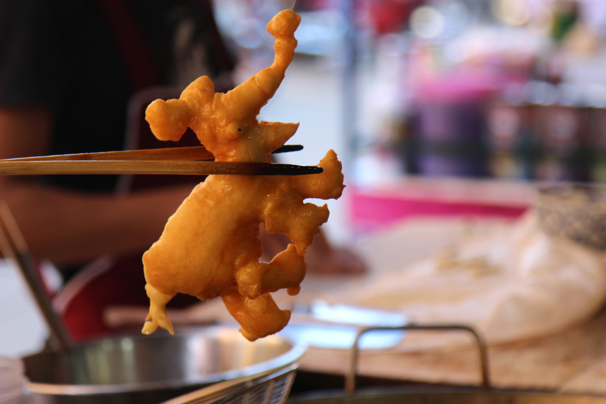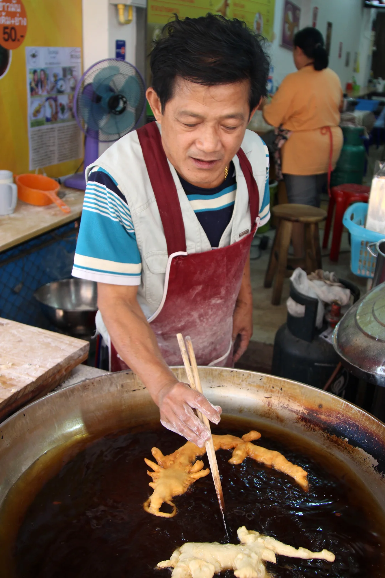 In a stroke of marketing genius, the restaurant went from making good fritters to making animal fritters. The menu reads somewhat scarily, opening with the choices of frog, crocodile, elephant, dinosaur, or for a few baht more, the very special dragon. And with that, Neng elevated his restaurant from just another place to that place. Hashtag animalfritters. Hashtag sorrynotsorry. Hashtag nomnomnomnom.