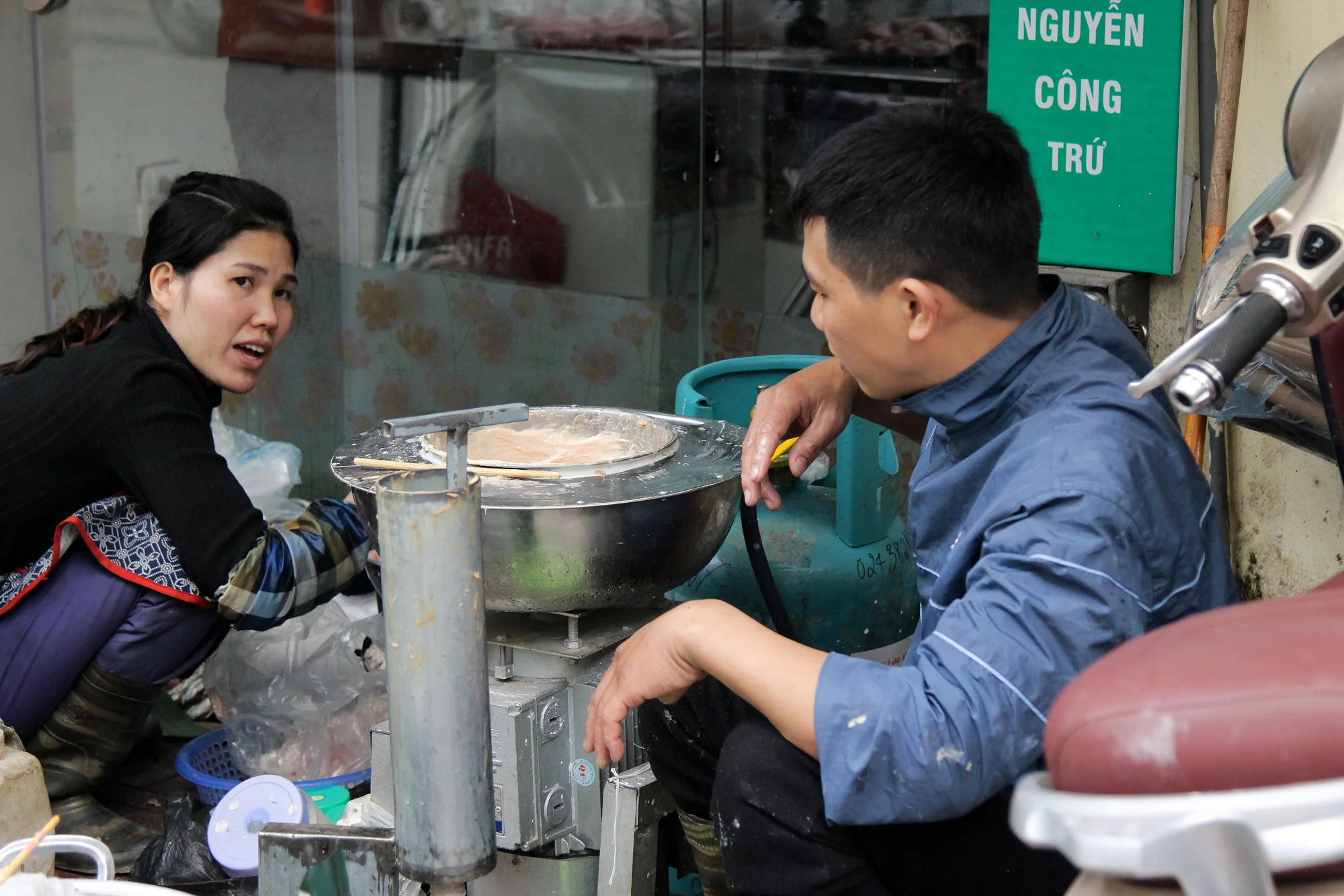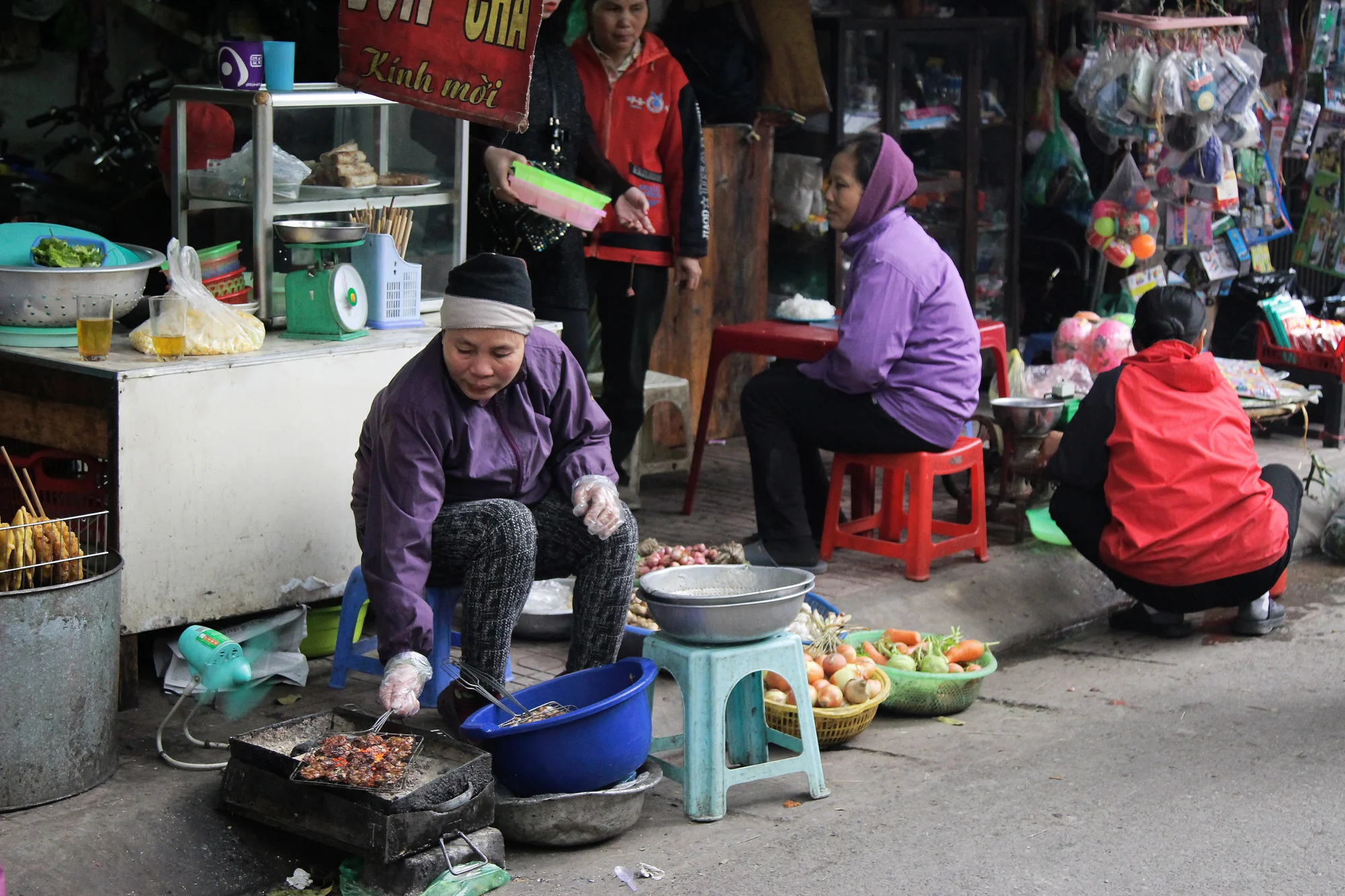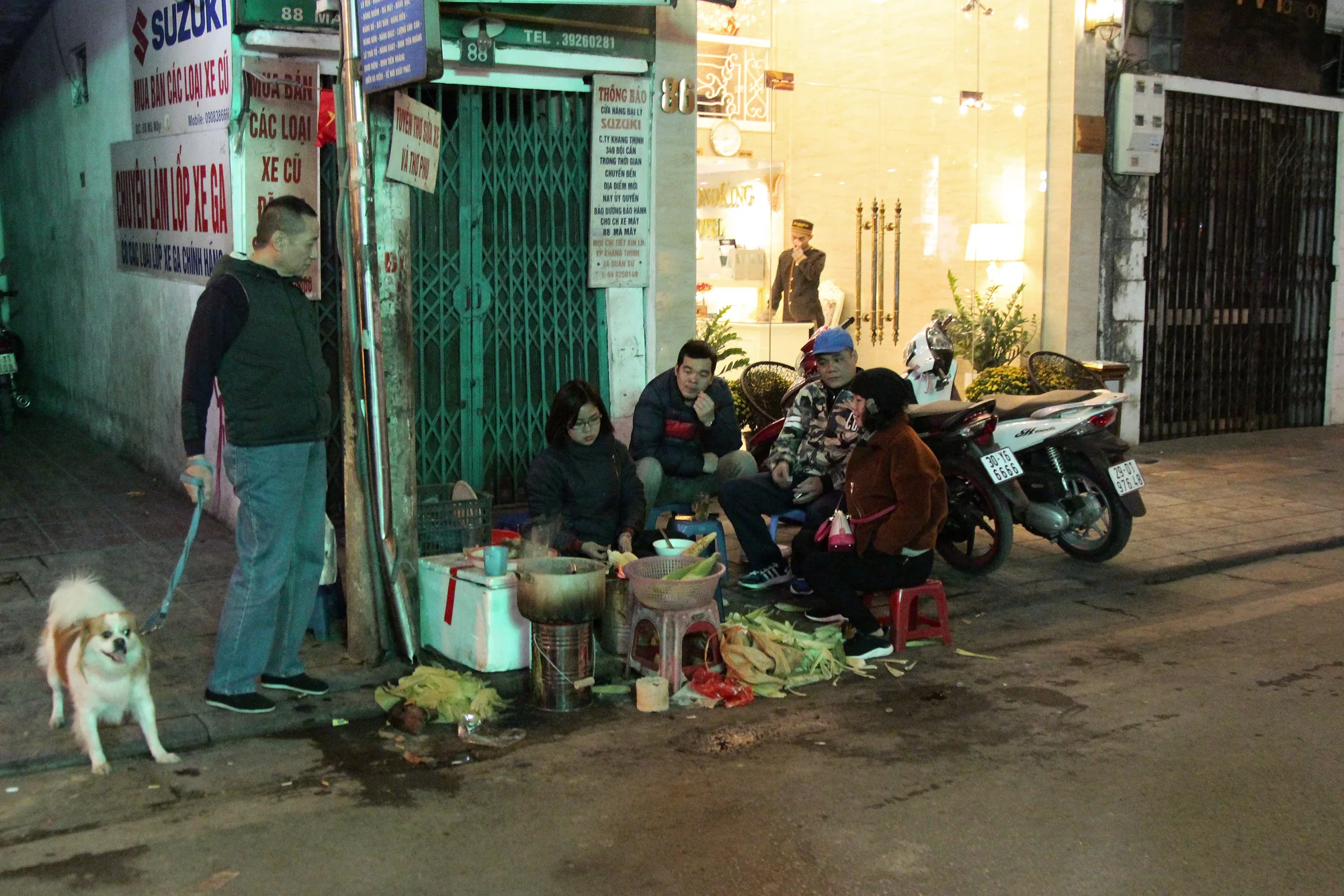We are in Vietnam and this is not unusual. As we walk through the busy streets in the centre of the northern city, little improvised kitchens start appearing on pavements like mushrooms after the rain, blending in happily with the countless street food stalls.