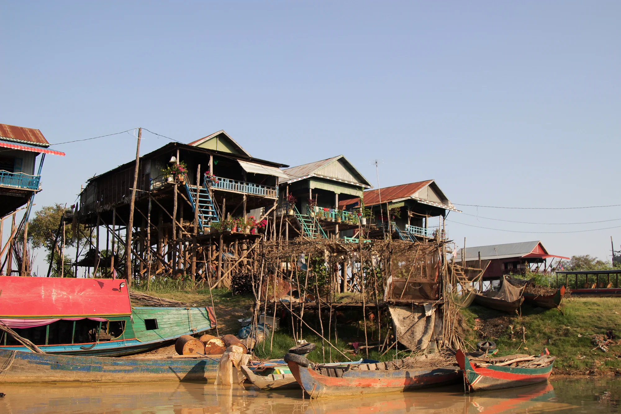 The village of Kampong Phluk, built out on the floodplain and home to around 5000 people, is a surreal sight in dry season. Metal shacks and basic houses perch six metres up, their wooden stilts naked, exposed. Fishing baskets hang redundant in mid-air. Flashes of rainbow laundry hang from walls of corrugated rust. A church, marked only by its scarlet cross, stands as a beacon of hope. Slim tailboats are parked in front of houses, like cars in a driveway, ready to carry the residents to floating schools, community centres and temples.