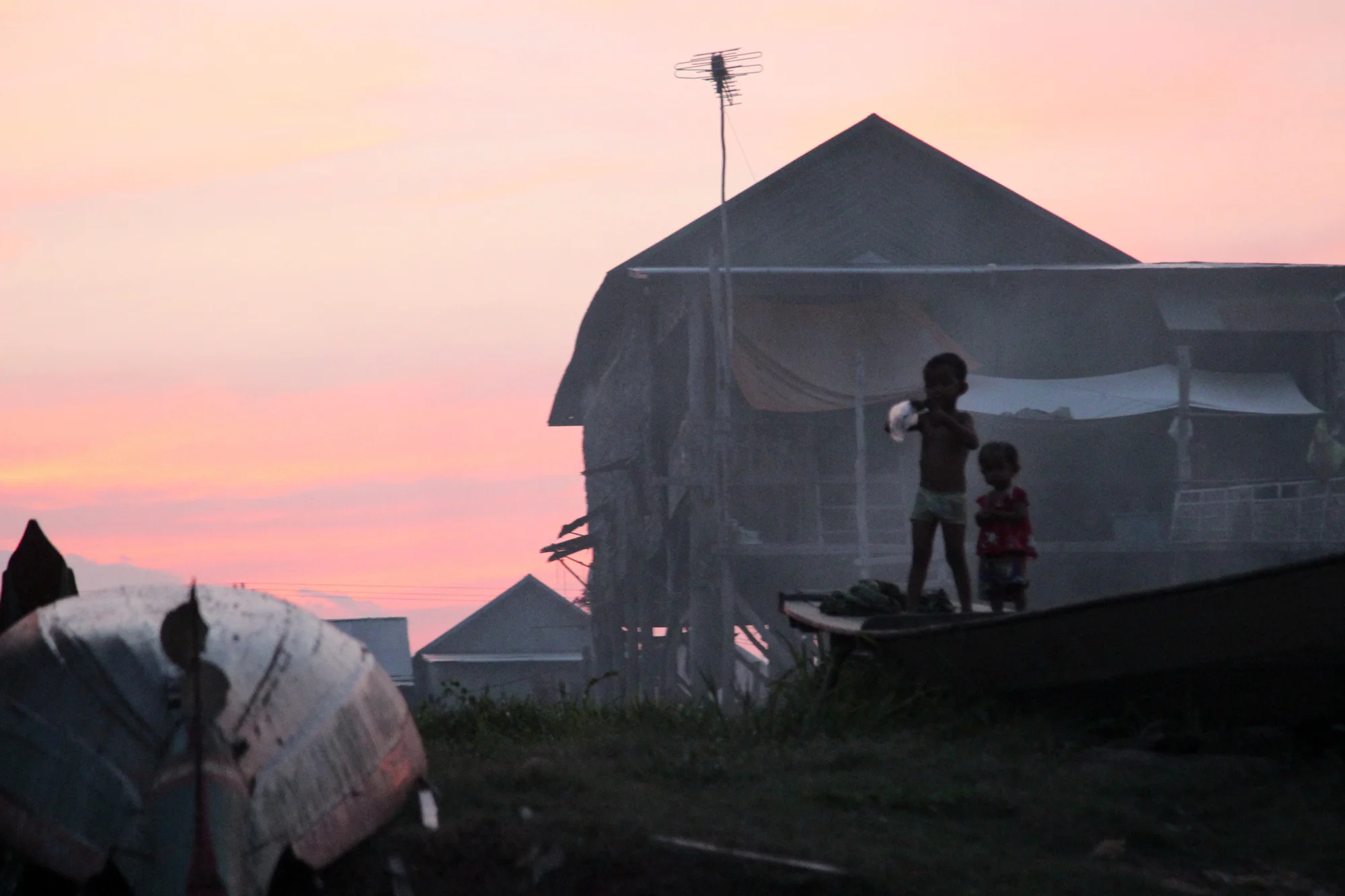 We cough. There is smoke billowing through the scene like dry ice across a stage set. Great cauldrons sit over flames, making warmth and making dinner. Someone shouts and a gaggle of siblings race barefoot towards the fire and the food. They’ll celebrate with a festival when the water rises up to their doorsteps again, but for these few months the space under their homes becomes a den, a playground and a family kitchen.